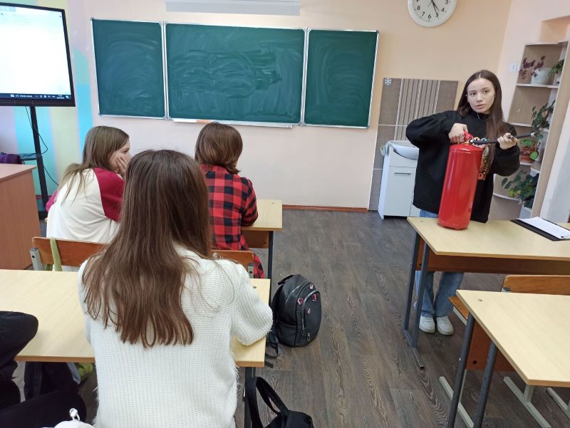 После теоретической части руководитель занятия продемонстрировал применение огнетушителя на практике. Учащиеся также смогли закрепить знания по практическим действиям с огнетушителем.
